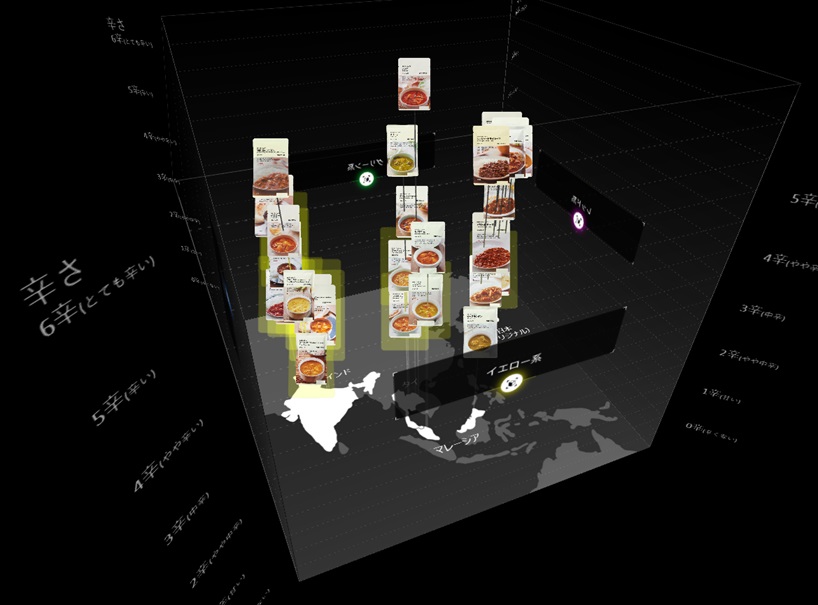 - 関係性を直感的に把握できる : 独自のキューブ状の表現で立体的に商品を配置し、各商品の複雑な関係などを視覚的に分かりやすく表現し、生活者と商品の偶然の出会いにもつなげていきます。