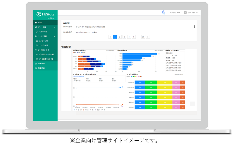 FitStatsを利用する企業は、専用の管理サイトで、利用者の同意のもとで得た食事・睡眠・運動・メンタル等に関するデータや属性情報、生活習慣、余暇の過ごし方など108項目のパーソナルデータから利用者を分析し、マーケティングデータとして活用することができます。さらに、アンケート機能にて利用者のニーズをより深堀りすることができ、自社の用途に合わせたデータへ深化させることも可能です。これらのデータをもとに利用者をさまざまなセグメントに分類して、一人ひとりに最適なコンテンツを配信できます。