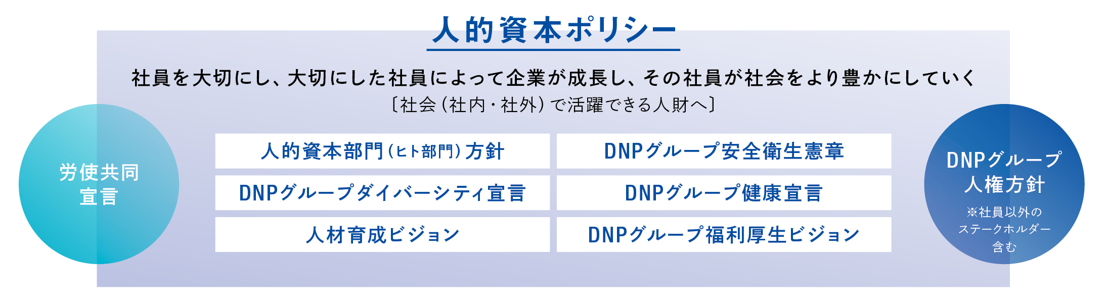 大日本印刷株式会社(DNP)は、持続可能なより良い未来、より心豊かな暮らしの実現に向けて新しい価値の創出に努めており、その重要な基盤である社員に対する投資「人への投資」を加速しています。これには、「一人ひとりが強みを伸ばし、社内・社外で活躍できる人材として育ってもらいたい」という思いと、「社員を大切にし、大切にした社員によって企業が成長し、その社員が社会をより豊かにしていく」という信念が根底にあります。DNPはこれらの社員に対する普遍的・基本的な考え方を、「人的資本ポリシー」として策定しました。