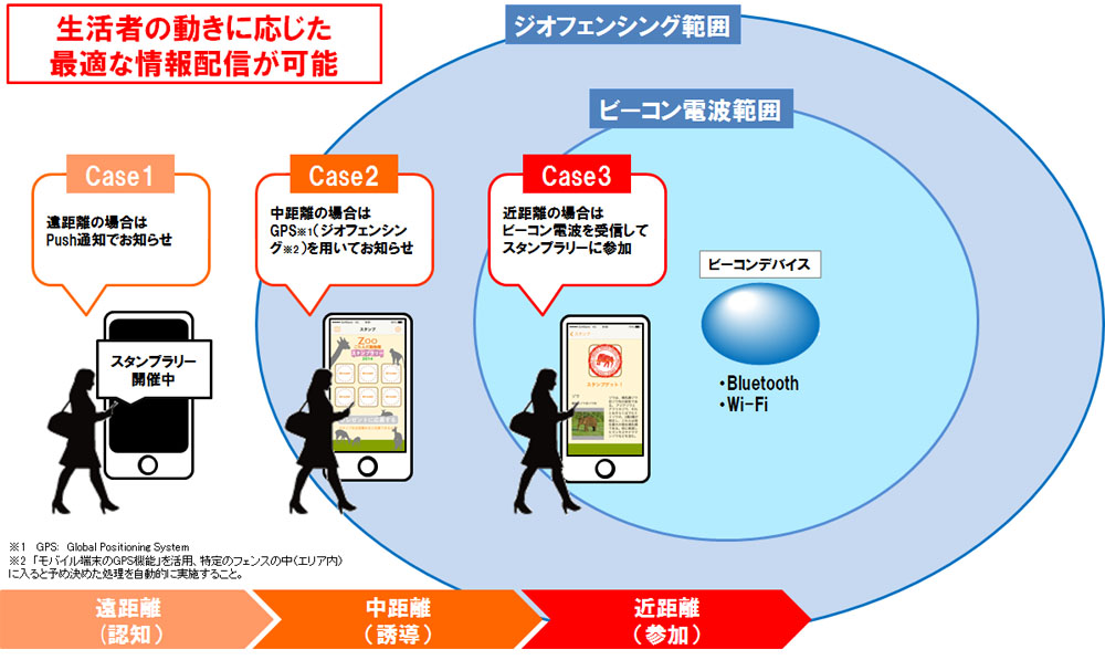 *1 ビーコン(Beacon) :発射される電磁波(電波または赤外線)を、スマートフォンなどの機器で受信することにより、自分の位置をはじめとした各種情報を取得する為の設備です。