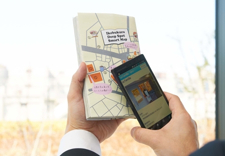 書店の協力を得て、NFCタグを貼付したブックカバーを生活者に配布します。そのブックカバーに生活者がNFC対応スマートフォンをかざすことで、池袋駅周辺の飲食店や観光スポットなどの情報が配信され、来店促進につなげるO2O(Onlineto Offline)プロモーションを展開します。ブックカバーには立教大生おすすめのディープスポットを示す地図を印刷し、“街歩き”へと導いていきます。一覧性に優れる印刷物の地図と、検索性に優れ大量の情報を掲載できるスマートフォン向けのデジタルコンテンツを組み合わせることで、効率的(スマート)に地域情報を提供します。