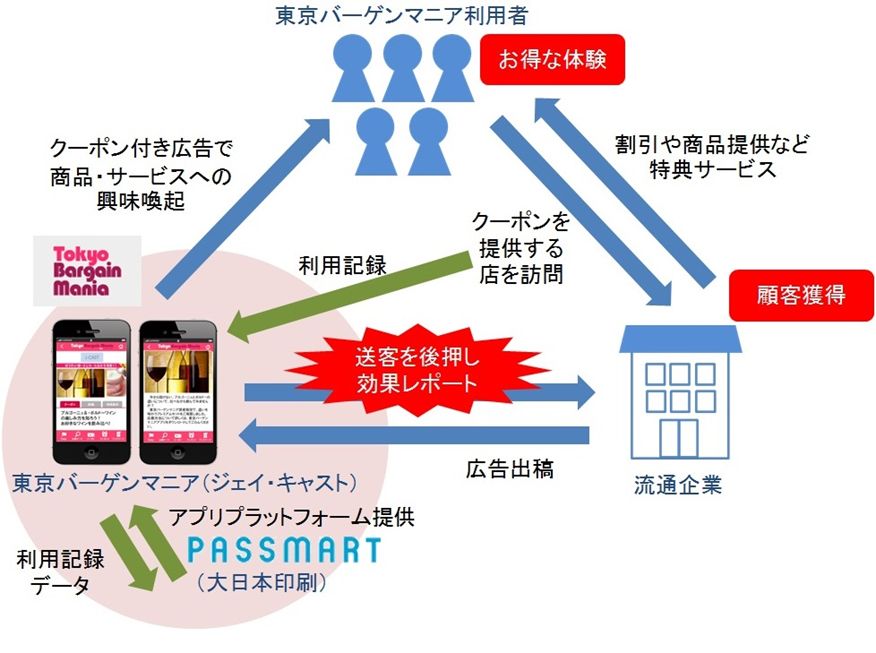 株式会社ジェイ・キャスト(東京都千代田区、取締役社長 大森千明)と大日本印刷株式会社(東京都新宿区、代表取締役社長北島義俊、以下 DNP)は、スマートフォン向けアプリを利用した新しい広告商品を共同で開発し、ジェイ・キャストが運営するお得情報サイト「東京バーゲンマニア」の公式アプリとして4月22日に提供を開始します。