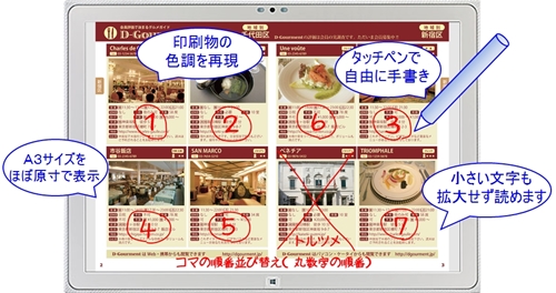今回使用するパナソニック製のタブレット端末「タフパッド4K」はA3サイズがほぼ同寸で表示できる高精細なディスプレーのため、細かい文字や図版なども見やすく、容易に校正を行うことができます。また、DNP独自のカラーマネージメントシステムに対応しているため、印刷物と同等の色調再現が可能となり、画面上で印刷物の色調を校正することができます。修正指示は、タッチペンを使って簡単に書き込めます。
