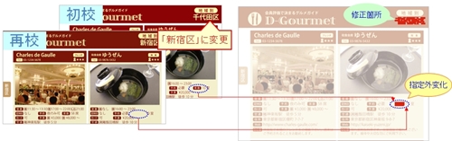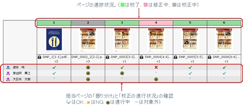 DNPのオンライン校正支援システムは、進行管理システムと連動し、各ページのDTPデータの進捗状況をリアルタイムで確認できるシステムで、インターネットに接続する環境があれば利用できます。印刷物の制作責任者は、商品開発者や編集者、デザイナーなどの複数の関係者に校正作業を分担させ、進捗状況や最新の印刷用データなどを管理することができます。管理業務の負荷軽減につながるため、責任者は本来の担当業務に専念することができます。また、校正作業を効率化しリードタイムが短縮できるほか、画面上で修正前と修正後の状態を比較できるため、修正漏れの防止にもつながります。