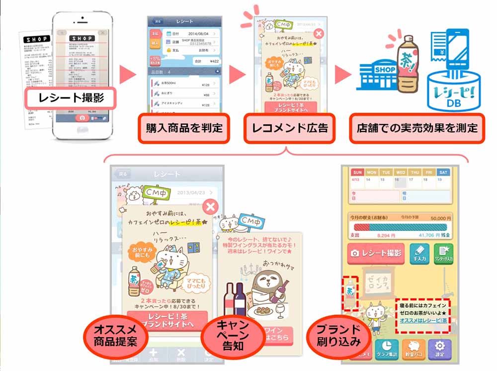 レシーピ!ウレCMは、レシートから読み取った購入商品やこれまでの購入傾向をもとに、その生活者が興味を持ちそうなオススメ商品をレシーピ!のキャラクターが提案する機能です。例えば、購入商品から妊婦や授乳中のママであると推測されるユーザーに対して、「ママに安心なカフェインゼロのお茶」などの商品を提案します。購入履歴に連動したレコメンド機能のため、単なる商品広告ではなく、「自分に合ったうれしい提案」として好意的に見てもらうことができます。また、家計簿という特性から、広告閲覧後の実購買につながったかを把握することができ、スマートフォン上の広告(オンライン)から実店舗(オフライン)での購買効果測定ができるのも大きな特長です。
