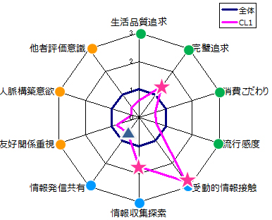 ライフスタイル/感度 | 「生活品質追求」「完璧追求」「消費こだわり」「流行感度」 |