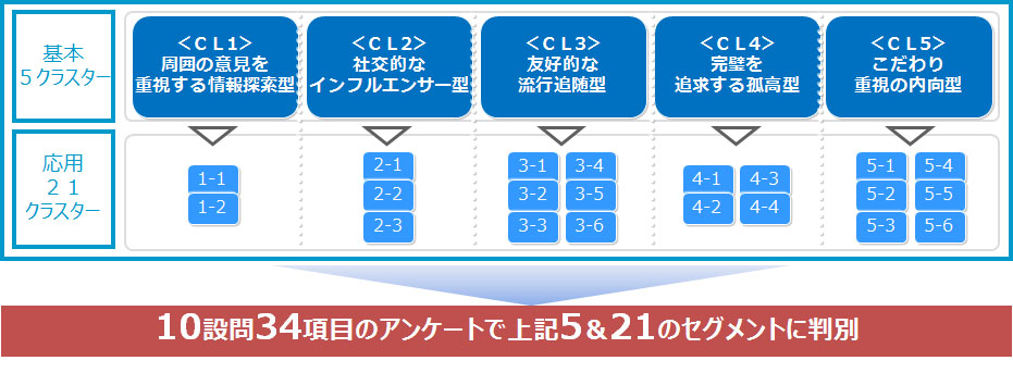 今回、社会状況やトレンドによって変化する生活者の価値観をより多面的に捉えるため、「ライフスタイル・感度」「メディア」「コミュニケーション」に着目し、10の基本評価軸を基に、各クラスターの特徴付けを行い新たなプロファイルを作成しました。新たなクラスターは、5つの基本クラスターと、その基本クラスターに属する21種の応用クラスターに分類されています。21の各クラスターは、「価値観データベース」に保有してある情報や顧客企業の持つ各種データを組み合わせることで、企業の業界に応じたプロファイルを作成することが可能になります。