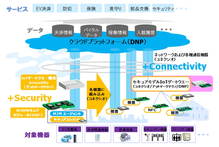 今回、DNPとコネクシオ、アットマークテクノは、各社の製品・サービスを組み合わせ、安心・安全なM2M/IoTシステムの構築に必要なクラウドプラットフォーム、ネットワークインフラ、ゲートウエー端末、NFC(*)モジュール、通信機器などを提供するサービスを開始します。3社連携によるワンストップサービスにより、企業は、安全なM2M/IoTシステムを、短期間で構築できるようになります。