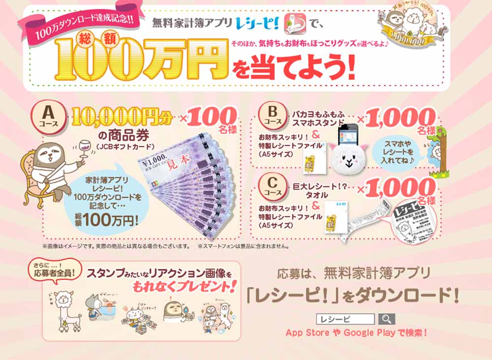 100万ダウンロード突破を記念して100万円分の商品券とオリジナルグッズが当たるキャンペーンも実施