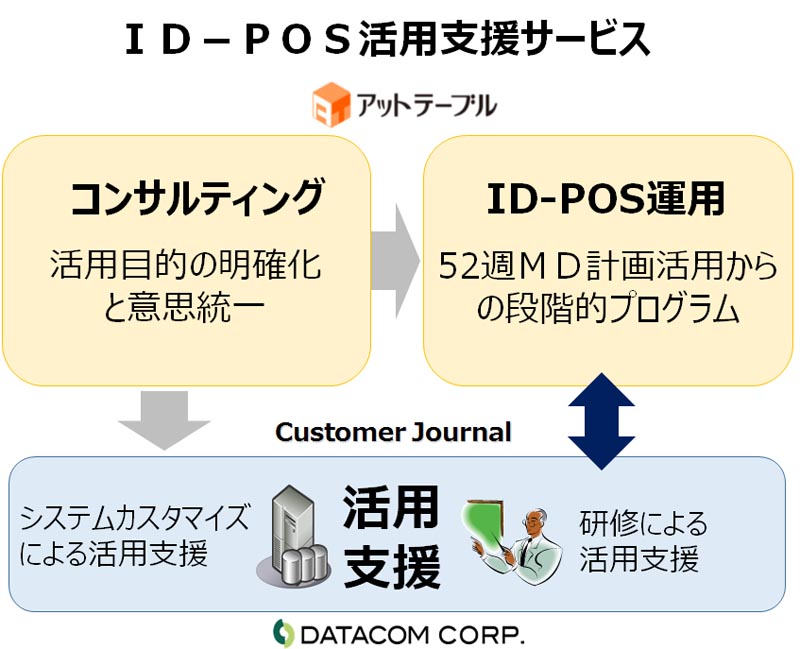 本サービスは、データコムのID-POS分析システム「Customer Journal」と、アットテーブルが提唱する「52週MD計画」を連動させ、ID-POSデータを活用して「戦略戦術策定」「戦術施策実行」「改善と発展活用」の3つのフェーズで、食品スーパーの業績向上に必要なマーケティング・販促活動を支援するサービスです。