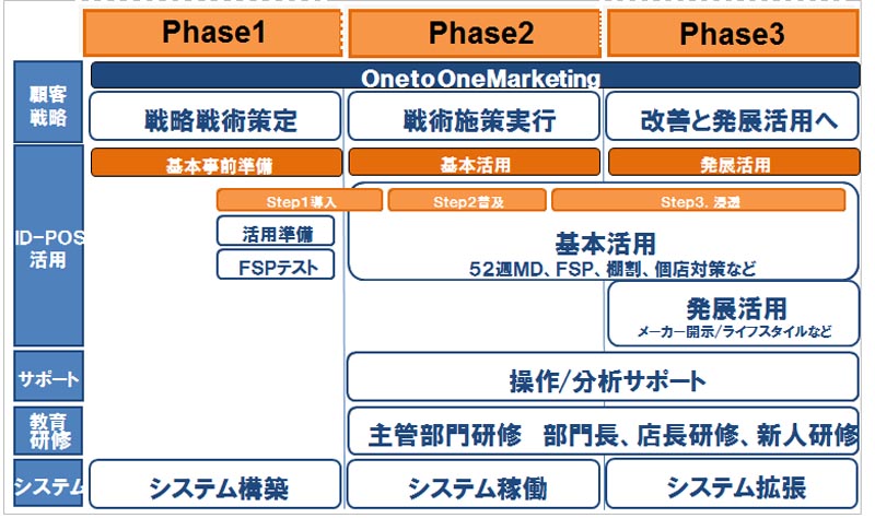 <Phase2> ID-POSデータを活用し、重点商品を中心とした店作りを1年間(52週)単位で運営して販売効果を高める「52週MD計画」とID-POS分析システムとを連動させ、食品スーパー全体の販売計画をサポートします。また、施策実行に必要な各部門のID-POS活用の目的に応じた人材育成のため、さまざまな研修を実施して社内での人材活用を促進します。