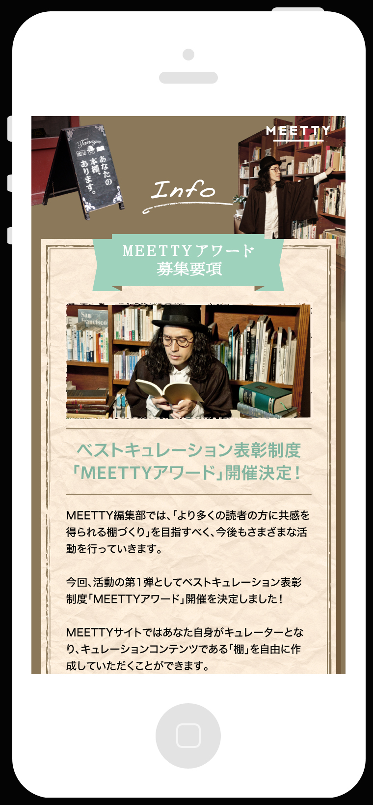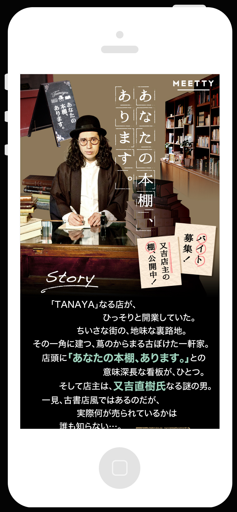 今回、MEETTYアワードのプロモーション企画として、本好きで知られるピースの又吉直樹(またよしなおき)さんに年間アワード選考委員長に就任いただきます。あわせて、MEETTY内に又吉さんが店主を務める「TANAYA」という謎の本屋をオープンし、MEETTYアワードを盛り上げていきます。
