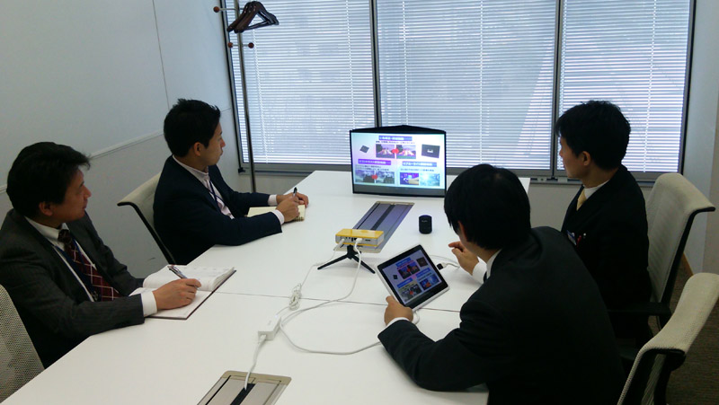 近年、商談や会議などで、タブレット端末を使って写真や動画などの資料を見せながらプレゼンテーションを行う機会が多くなっています。しかし、「タブレット端末の小さい画面は複数の人では見づらい」「相手に画面を見せながら説明している間、自分は画面を見られず操作もできない」など不満がありました。また、タブレット端末を使わずに資料をプリントアウトして配付する場合は、動画や音声が使えないといった課題がありました。