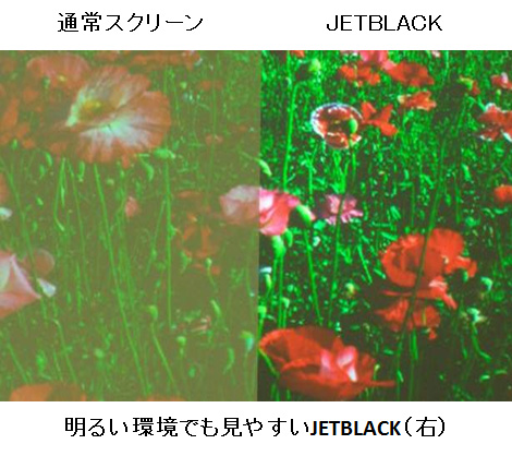JETBLACKは、プロジェクターから投影される光の反射に加え、周辺の光を吸収するため、通常のホワイトスクリーンと比べて約5倍のコントラストがあり、明るい部屋(1000ルクス程度)でも高い視認性を保持し、鮮明な映像表示が可能です。