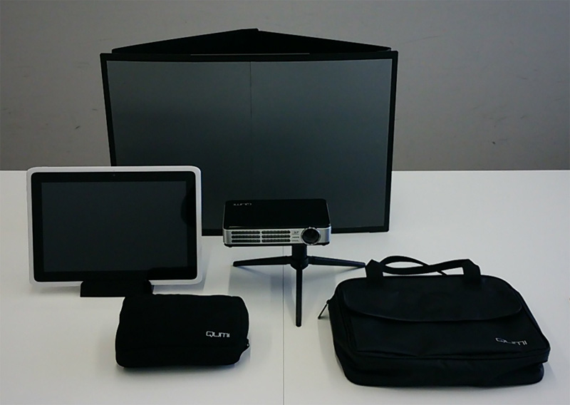 スクリーンとして使用時の大きさは、横480mm×縦325mm×奥行150mm(画面は約21インチ型相当)ですが、コンパクト(横325mm×縦275mm×奥行13mm:約B4サイズ)に収納して、ビジネス鞄で持ち運ぶことができます。