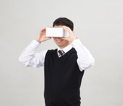・スマートフォンをセットしたヘッドマウントディスプレーで、360°シアター感覚でVR動画や静止画などのコンテンツを楽しめます。紙製のヘッドマウントディスプレーは、折りたたみ式で運搬しやすく、外装に装飾印刷も可能で、製造も簡単です。