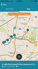 1 出発前 : スマートフォン等に本アプリをダウンロードし、目的地、または「歴史を学ぶ」「景色を楽しむ」などのテーマを選ぶと、お薦めの周遊コースが表示されます。利用者が気に入った周遊コースは、メールなどで同行者と共有することができます。