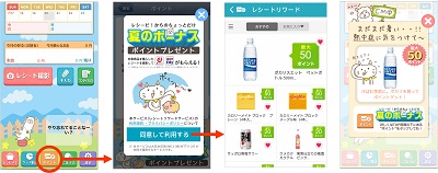 1)レシーピ!の「ポイント」のメニューボタンからバナーに従ってクリックすると、ポイント還元の対象商品が表示されます。ユーザーのレシートの購買履歴に応じて、掲載される対象商品が変わります。また、レシーピ!利用中にも、購買履歴に応じたおすすめ商品とリワードの提案が届きます。