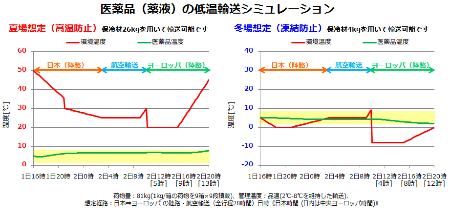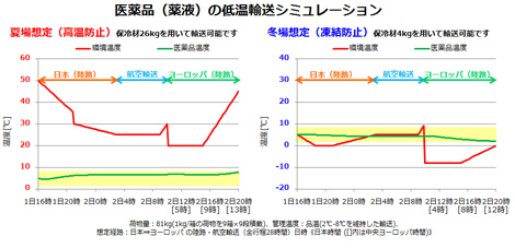 ボックス内に保冷材を入れることで、商品や輸送時間に適した冷蔵定温輸送も可能になります。輸送環境温度や輸送時間において商品が入るボックス内の温度変化のシミュレーションが可能で、保冷材の使用量を最適化(削減)します。