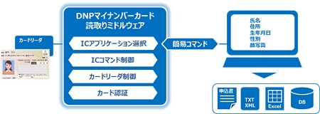 大日本印刷株式会社(DNP)は、個人番号カード(マイナンバーカード)を活用した各種申請業務の効率化などに向けて、マイナンバーカードに記録された基本4情報(氏名・住所・生年月日・性別)と顔写真データを、正確かつ迅速に読み取るソフトウエア(ミドルウエア)を開発しました。