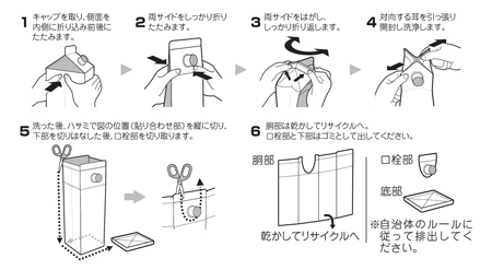 アルコール飲料向けの液体紙容器は、内容物保護の観点からバリアフィルムの紙への貼り付け強度を高めているため、リサイクルや廃棄の際の解体に手間がかかることが課題とされてきました。DNPは、2016年5月に廃棄時に容易に切り開くことができる「解体しやすいタイプ」と紙層と内装のフィルム層を簡単に剥がして分離できる「紙とフィルムを分離できるタイプ」の2種の液体紙容器を開発しました。今回「解体しやすいタイプ」において、容器の天部に特殊な易開封加工を施すことによって、天部の開封性を大幅に改善することで解体をさらに容易にした「DNP易解体液体紙容器」を開発しました(下図3と4の解体が簡単にできます)。従来品と比べて密封性やシール強度などに差はなく、また既設の充填機などの生産ラインで対応可能のため、設備改造や新規設備導入の必要はありません。