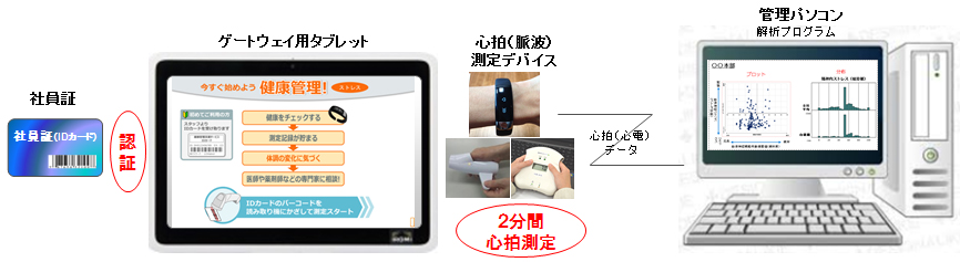 本サービスは、専用の機器を使用して、従業員の心拍や脈波を一定期間測定し、その心拍変動を株式会社疲労科学研究所(本社:大阪 社長:倉恒邦比古)の「心拍変動解析プログラム」で分析することで、疲労やストレス状態を把握・見える化し、従業員の健康維持を支援するものです。