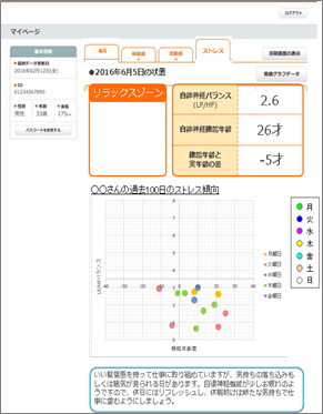- 数値をマトリックス状に図としてプロットし、各人の測定時のストレスと疲労度を“見える化”し、各人の疲労・ストレスの状態の解説と回復のためのアドバイスを行います。
