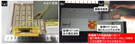 今回、新たに極薄シリコン・フレキシブル基板実装技術と、保護フィルムと接着フィルムとの一体化技術を開発し、現場で簡便に貼り付けられるフレキシブル面パターンセンサーを開発した。これを貼り付けた橋梁上を車両が通過すると、フレキシブル面パターンセンサーが橋梁と一体となってひずみ、極薄PZT/Siひずみセンサーがひずみに比例した電圧を出力するため、動ひずみ分布を高感度で計測できる。橋梁に亀裂などの欠陥があると、車両通過時のひずみ分布に異常が現れることを利用して、橋梁の劣化状態をモニタリングできる。