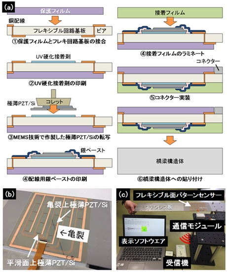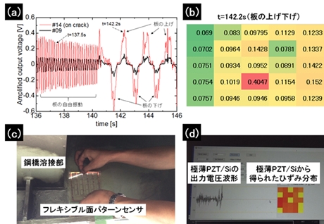 橋梁構造体に貼り付けたフレキシブル面パターンセンサー(図1(b))、アンプ・通信モジュールや受信機でセンサーネットワークシステム(図1(c))を構成して、橋梁の劣化状態を常時モニタリングする。なお、今回は圧電薄膜にPZT薄膜を用いているが、有害物質を含まないAlN、ScAlNなどの圧電薄膜も、同様に使用できる。
