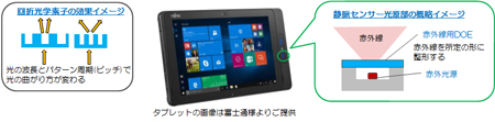 今回量産に成功した光学素子は、小型化に対応可能という特長を活かして、富士通株式会社のスライド式静脈認証機能搭載のタブレット端末「ARROWS Tab Q507/P-SP」に採用されています。