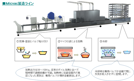 ②マイクロ波加熱により食材の調理・殺菌を同時に行う。