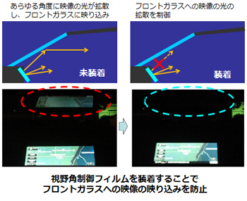 下方に映像などの光を集中させる視野角制御フィルムを使用することで、運転席からの視認性を高め、フロントガラスへの映り込みを防ぎます。