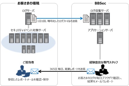 日々収集するログの確認は、BBSecの経験豊富な専門スタッフが行い、確認結果を分かりやすくまとめたレポートを 365日、指定された宛先にメールで送信します。レポート内容の不明点など、メールや電話での問い合わせにも対応します。