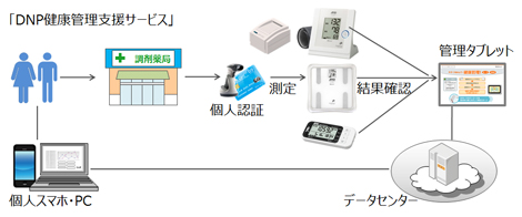 全国の自治体では近年、地域住民の健康診断の受診率が向上しないことが課題となっています。この課題に対してDNPは、地域に密着したドラッグストアや調剤薬局の店頭で、血圧や体脂肪率などを手軽に測定できる「DNP健康管理支援サービス」を提供しています。一人ひとりの測定データは、高度な情報セキュリティ機能を備えたDNPのデータセンターで最大3年分を安全に保管するため、生活者は安心してサービスを利用できます。