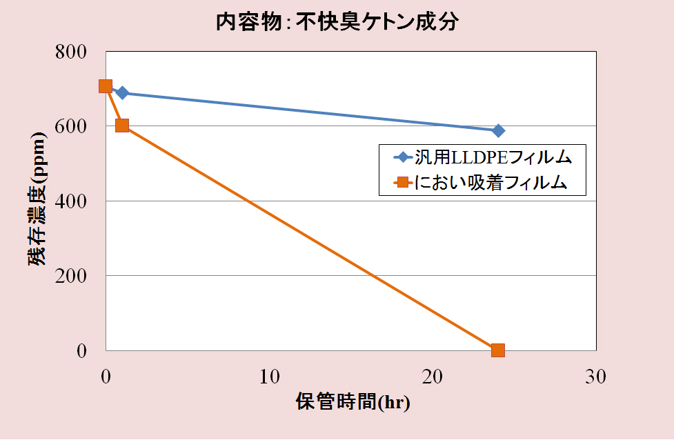 ガス吸着評価実験では、不快臭ケトン成分がフィルムに吸着され、24時間後にガスがほぼ100%フィルムに吸着されることが確認できました。