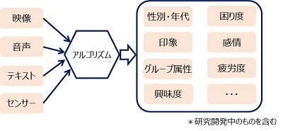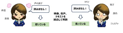 これまでも、音声、または顏の表情から、感情を分析する技術はありましたが、人間のように様々な情報から総合的に判断しているわけではないので、十分な精度がでない場合もありました。それに対してDNPの状況認識技術は、音声だけでなく、映像やテキスト、センサー情報も含めて、AIによるアルゴリズムにより統合的にその人の状況を分析、推定し、的確な対応を図ることができます。