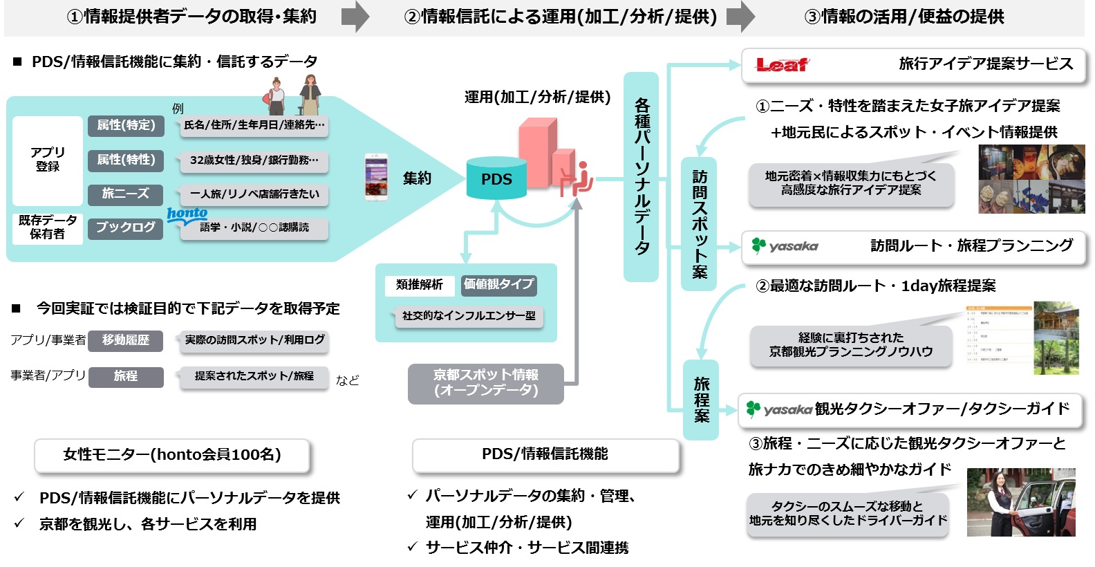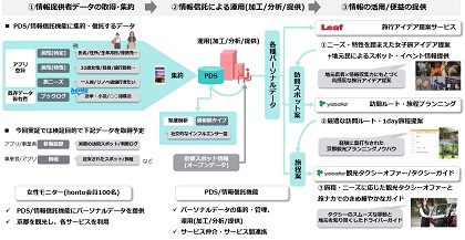 参加者の同意に基づき、パーソナルデータは“情報信託機能”を介して株式会社リーフ・パブリケーションズと彌榮自動車株式会社に提供されます。リーフ・パブリケーションズは、このパーソナルデータと、自社が保有する京都観光情報や京都市のオープンデータ等を掛け合わせて、参加者一人ひとりに最適な観光情報をアプリを通じて提供します。彌榮自動車は、リーフ・パブリケーションズが提供する観光情報に加えて、最適な観光コースやその中の最適な区間でのタクシー利用を提案します。