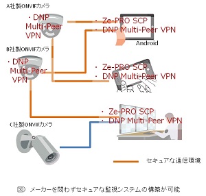 しかしインターネット上で監視カメラ映像を通信する際には、映像の流出や不正アクセス対策など、情報セキュリティの確保が重要です。「Ze-PRO SCP」に「DNP Multi-Peer VPN」を予め組み込み、顧客に提供することで、ビューワーの開発段階でセキュアな通信環境を構築し、システム開発にかかる時間とコストを削減します(図)。
