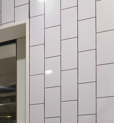 オリジナルなデザインで1枚から作製できる表面がフラットで清掃しやすい不燃化粧板です。インクジェットによるオンデマンド印刷で、タイル調や石目柄などの高い意匠性と、デザインや用途に合わせた「艶あり」「艶なし」「エンボス」の3つの表面仕上げが選択できます。耐熱性に優れ、キズが付きにくく、汚れをサッとふき取れるなどメンテナンスが簡単で、フードコートやオープンキッチンなどの壁面に最適です。