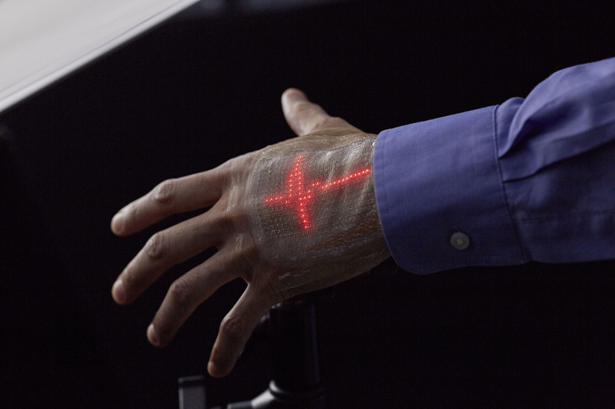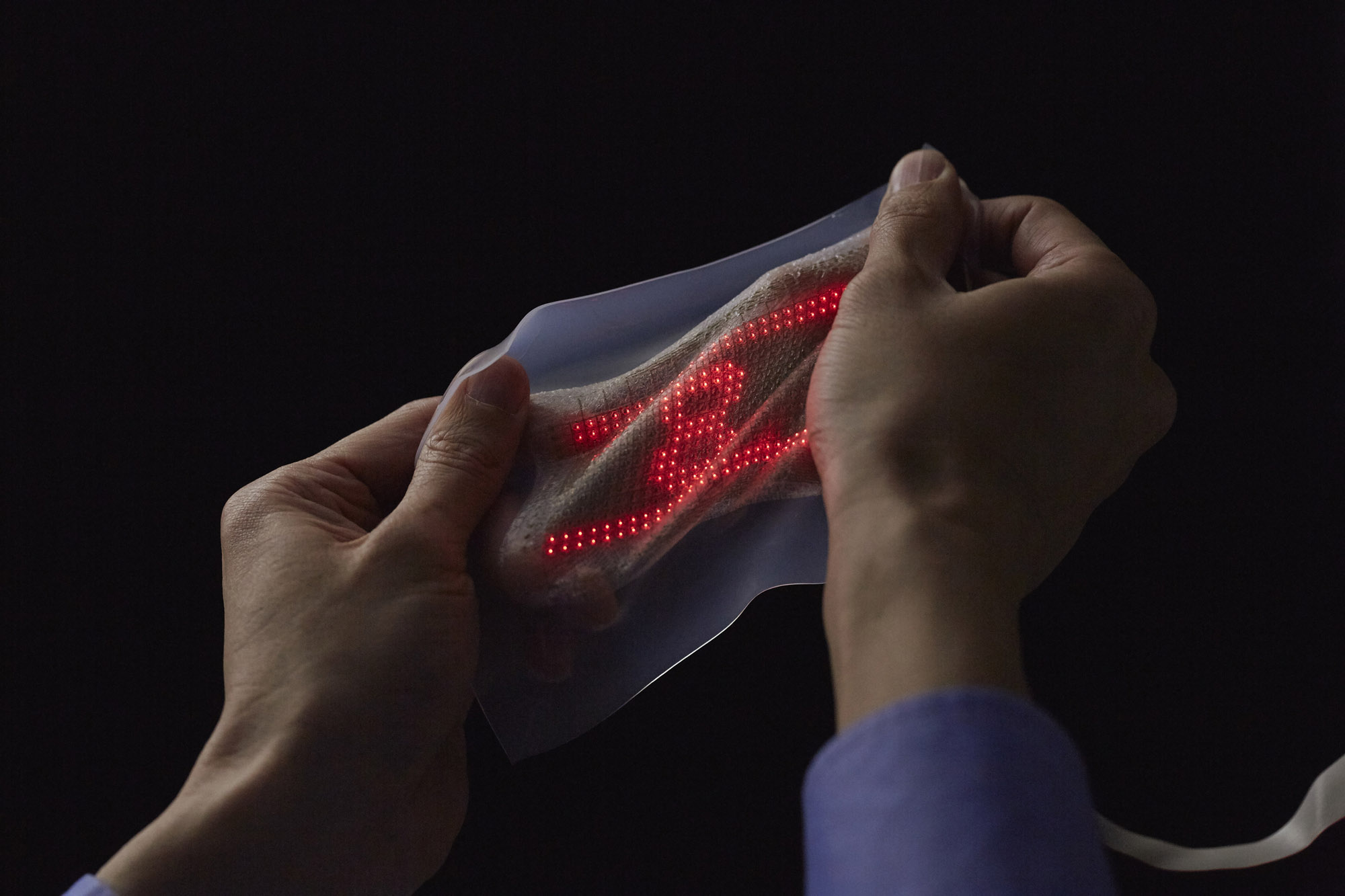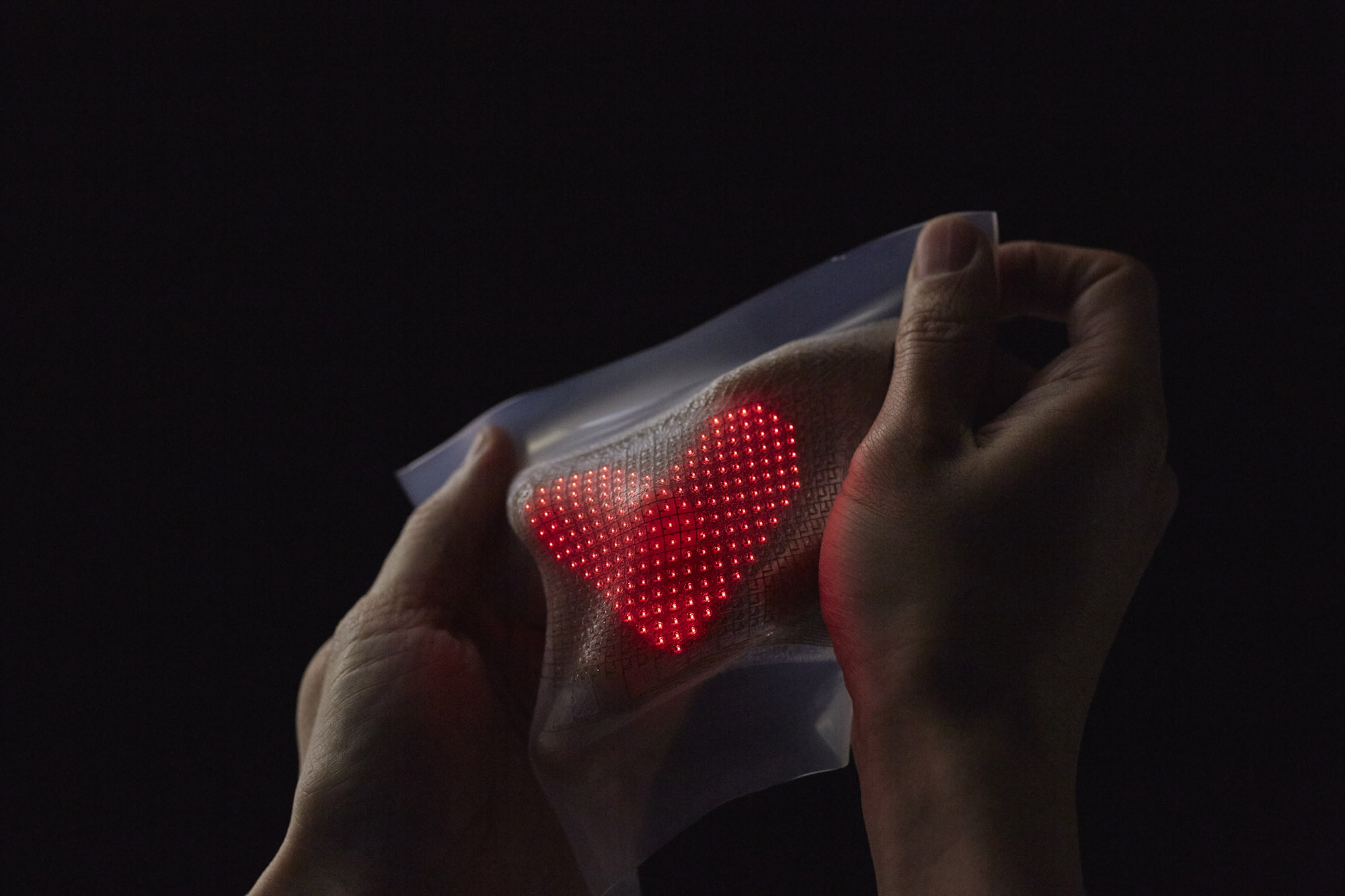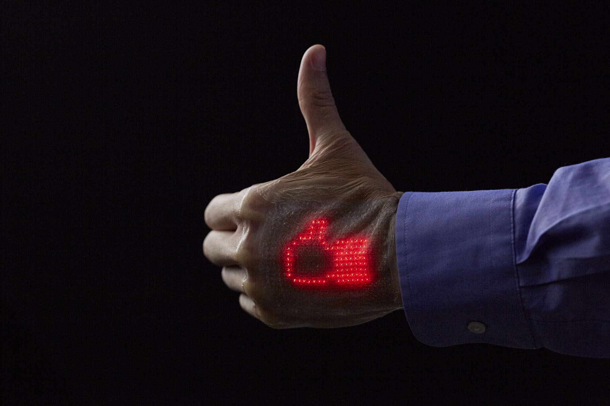 薄型で伸縮自在のディスプレイで、皮膚に直接貼り付けて使用することができる。