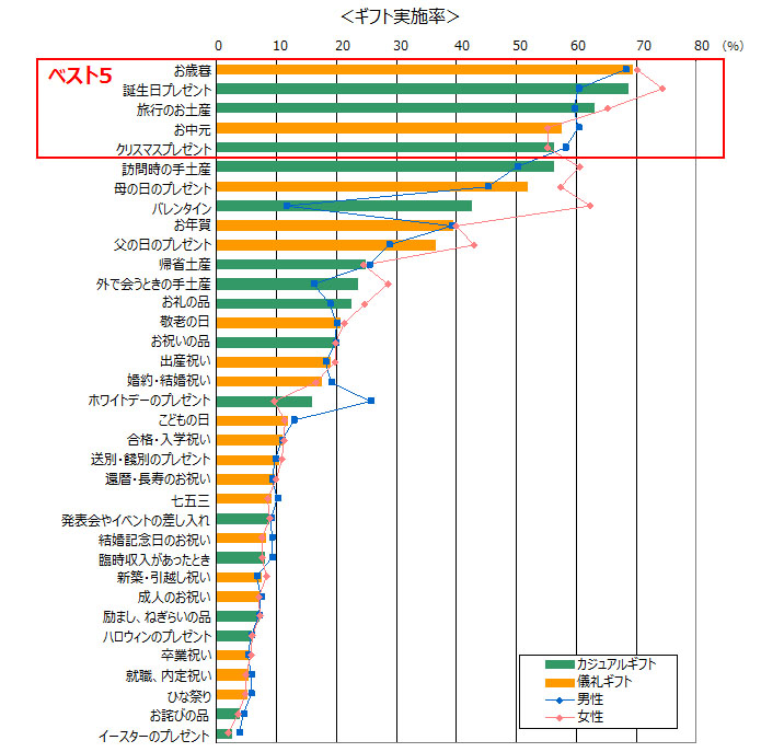 ■ ギフト実施率トップ5はカジュアルギフトが目立つ <グラフ1参照>