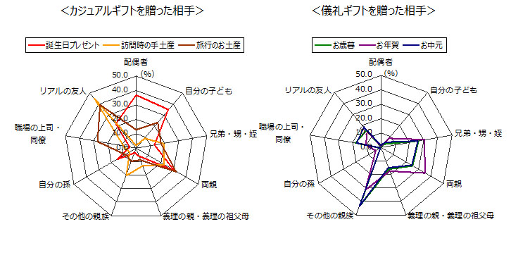 それに対しカジュアルギフトは、配偶者や子供、友人や職場の同僚などに贈ることが多いことが分かった。日々顔を合わせているものの、気持ちを伝える機会が少ない身近な人々とのコミュニケーションの機会として、カジュアルギフトが活用されていると言える。