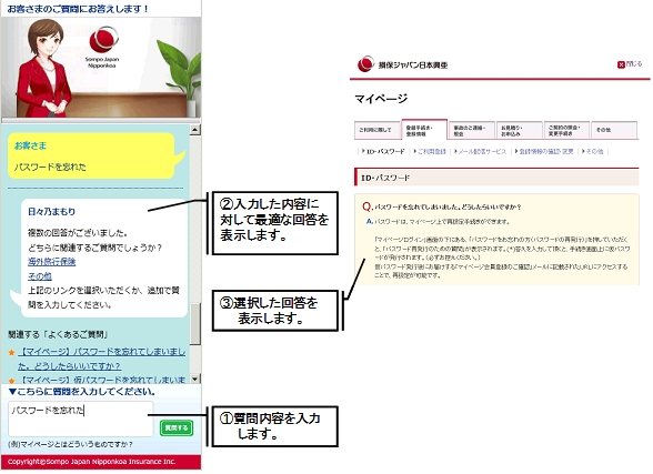 損保ジャパン日本興亜の「バーチャルナビゲーションシステム」は、お客さまがウェブサイト内の「よくあるご質問(FAQ)」に口語体で入力した質問文章を解析し、その意図を正しく理解して、ウェブサイト内の適切な情報に導くDNPのコンシェルジュシステム「Faceコンシェル」を利用しています。画面に登場するキャラクター「日々乃(ひびの)まもり」が、会話を通じて、お客さまを適切なFAQに案内します。FAQを絞り込めない場合は、「日々乃まもり」が逆に質問して会話を重ねることで、お客さまのニーズを具体的に確認していきます。
