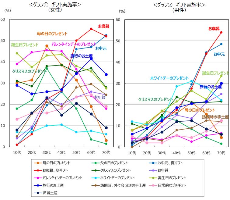 女性は、内容は異なるものの、どの年代もギフトを贈っている。若年層は誕生日やバレンタインデーなど、特別なイベントを楽しむためのギフトを、年配層はお歳暮、お中元、お年賀など、礼儀や挨拶のためのギフトを多く贈っている。一方男性は、若い年代でのギフト実施率が低く、妻や子ども、孫などの家族が増えていくとともに、ライフイベントにともなってギフトとの関わりが生まれている。(図1)