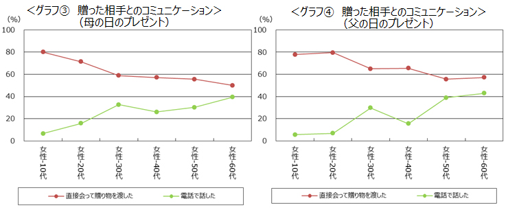 10代、20代の女性は、母の日や父の日のプレゼントを「直接会って渡した」割合が約8割と高かった。また、母の日に定番の「花」を贈る割合は低く、「自分らしさや感性を表現したい」割合が他の年代よりも高いことがわかった。若年層の女性にとって母の日や父の日が家族とのイベントの一つとなっている実態が捉えられた。(図2)