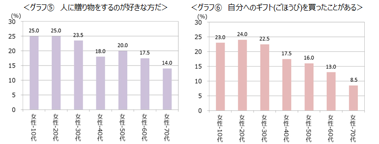 10代、20代の女性は、「人に贈り物をするのが好きな方だ」という割合が25%。SNSで友人とつながるなど、コミュニケーションを重視する若年層にとって、ギフトの機会はコミュニケーションの一部として好意的に活用されている。また10代~30代女性が「自分へのギフト」を贈る割合は2割を超え、自分のための消費のきっかけになっていることがわかった。(図3)