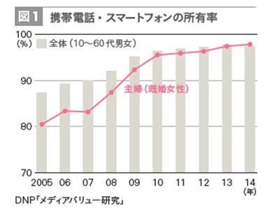 大日本印刷(DNP)は、主婦のネット利用と暮らしの変化を捉えた「メディアバリューレポートVol.71」を発行しました。2014年に実施した「メディアバリュー研究」の定点調査では、首都圏在住の主婦の携帯電話とスマートフォンの所有率が10~60代男女全体の平均を超えました(図1)。主婦がスマートフォンを利用するようになったことで、主婦同士の情報交換が活発になり、自分の感性に合った商品・サービスに辿り着きやすくなるなど、主婦のネット利用とライフスタイルに変化が表れていることがわかりました。