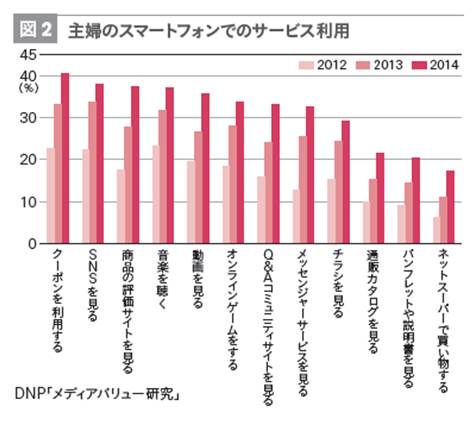 ここ数年、主婦がスマートフォンで利用するサービスは変化しています。最も利用されるサービスは2012年は「音楽を聴く」でしたが、2014年にはクーポンやSNSなど買い物やコミュニケーションに関わるサービスが上回りました(図2)。スマートフォンの普及によって主婦の情報受発信が活発になり、主婦の目線による暮らしの情報が共有されるようになっています。特に、主婦の想いを実現するものや、家事や暮らしに彩りを添えるような、従来の固定概念を変える商品などが共感を得るようになり、新しい生活スタイルが生み出されています。