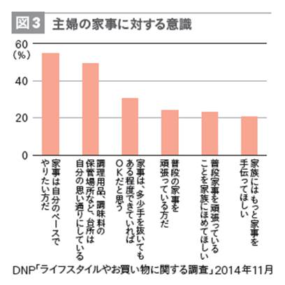 主婦の約5割が家事を「自分のペースで行いたい」、約3割が「多少手を抜いてもいいと思う」と考えていることがわかりました(図3)。スマートフォンの浸透によって、家事や子育てなどの共通項を持つ主婦同士がつながり、そこで生まれた情報の循環によって、主婦の家事との関わり方も変化しています。