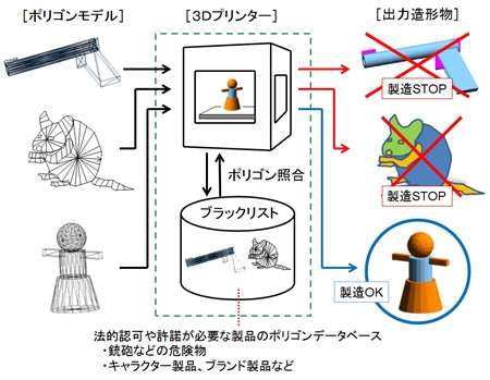 - ブラックリスト対象製品は適宜追加登録でき、銃器などの危険物だけでなく、著作権保護の対象となるキャラクターのフィギュアなどの3Dプリンターによる製造を規制することができます。